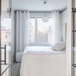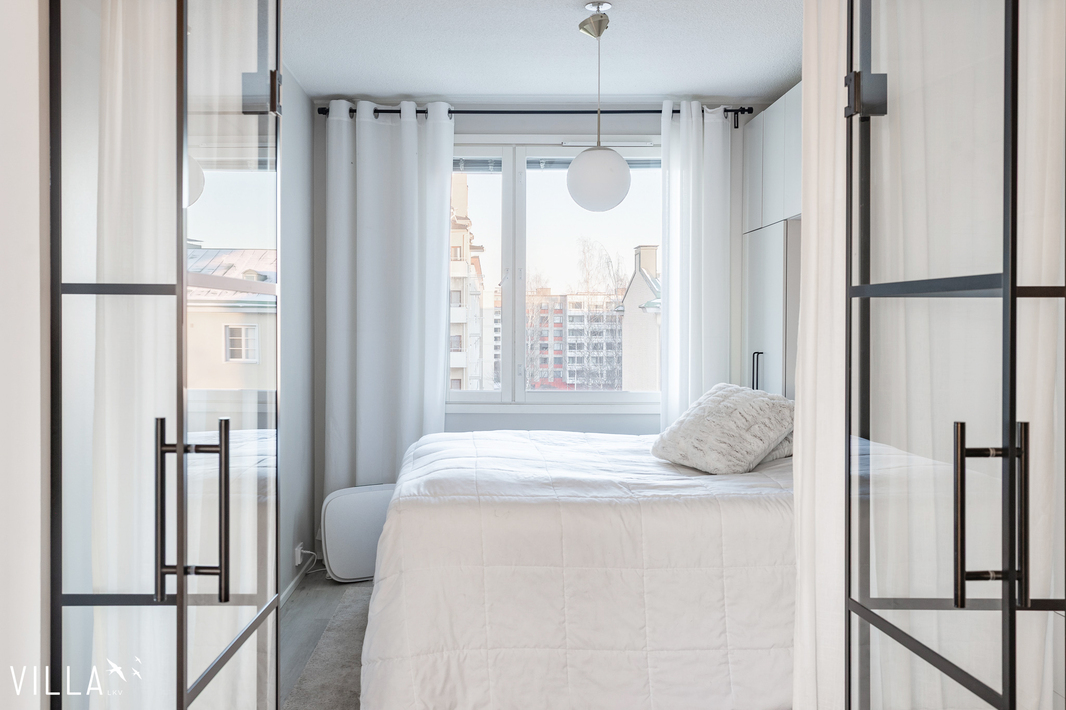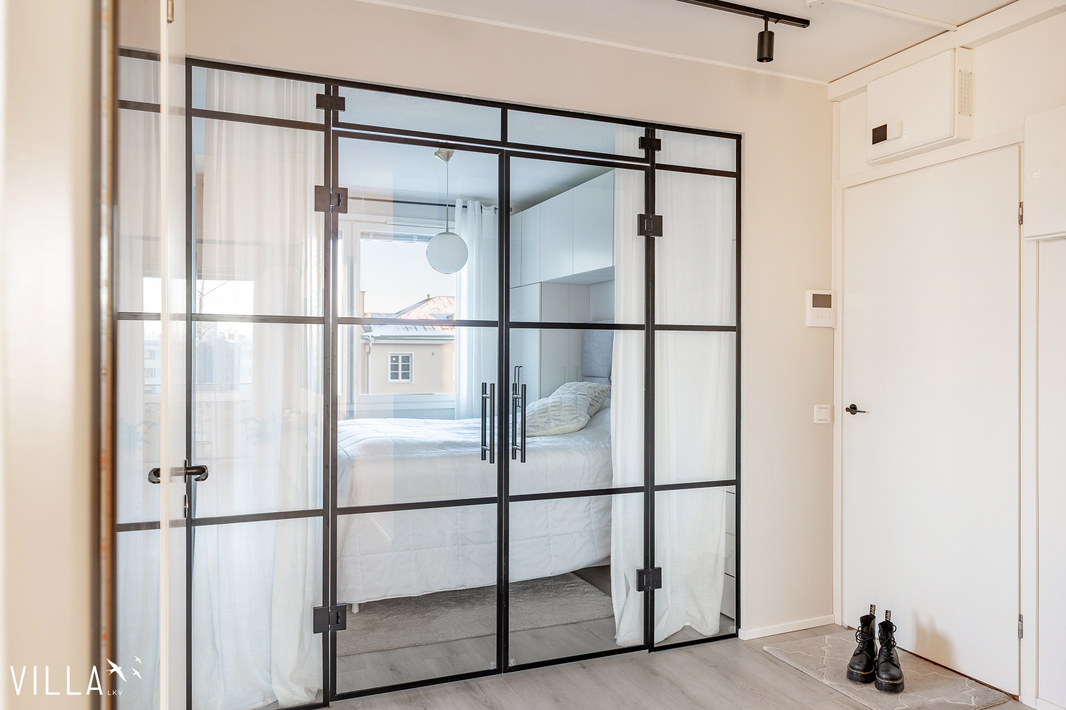 | Makuuhuoneen kuvaus | Glaso lasiseinä kahdella ulos-sisään aukevilla ovilla. |