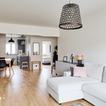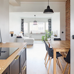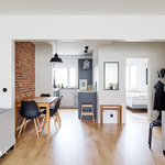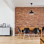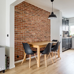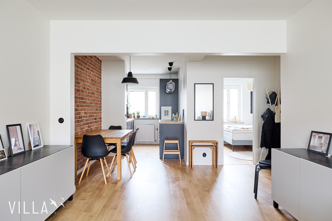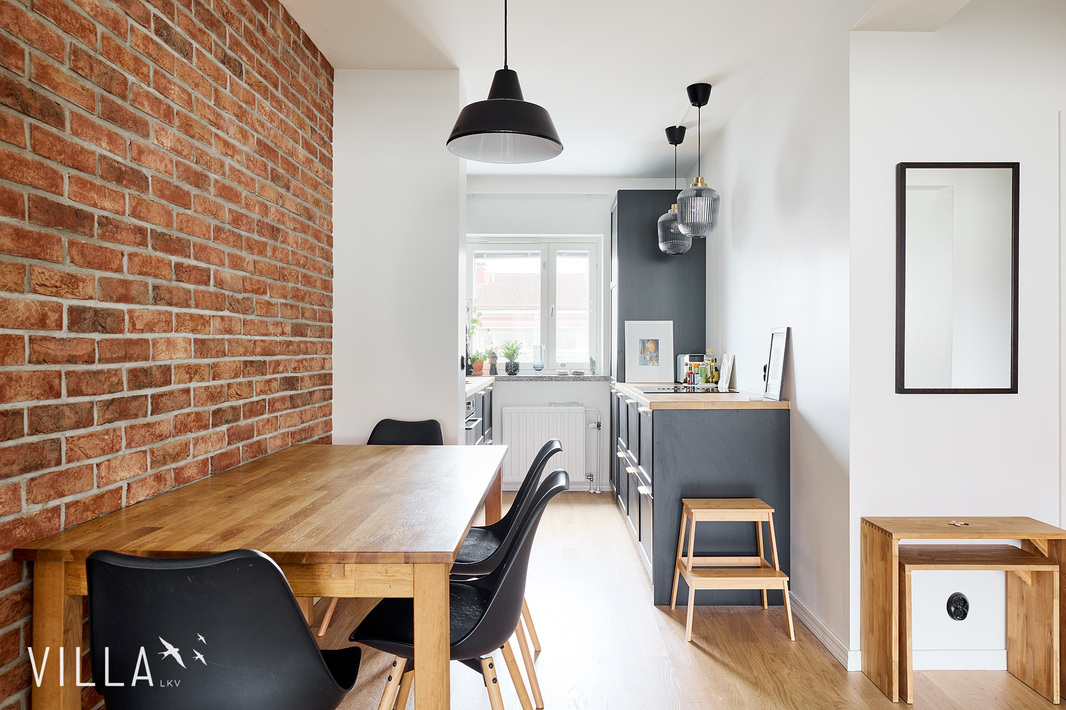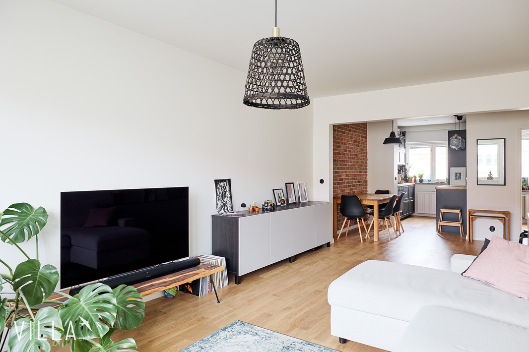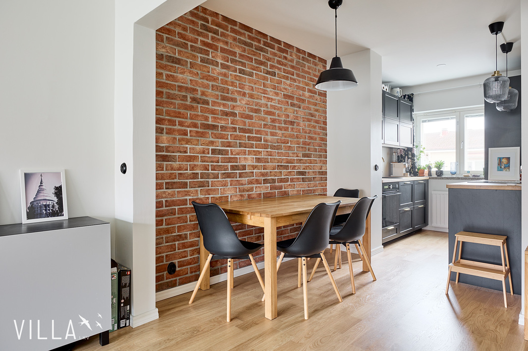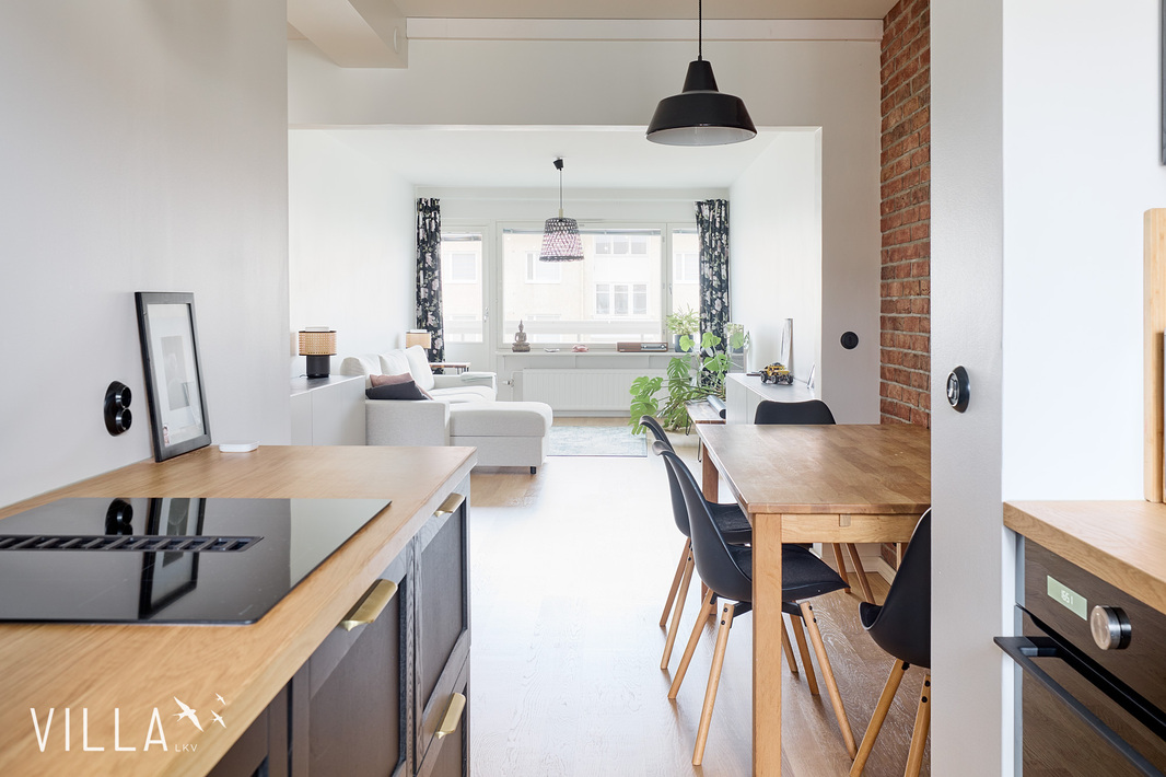 Tässä kodissa 50-luvun tunnelma yhdistyy selkeään ja ajattomaan ilmeeseen. Läpitalon huoneisto tuo tiloihin runsaasti luonnonvaloa, ja avara pohjaratkaisu tekee kokonaisuudesta toimivan ja viihtyisän. Kauniit materiaalivalinnat ja näyttävä tiiliseinä viimeistelevät tilan ilmeen ja tuovat siihen selkeää luonnetta.