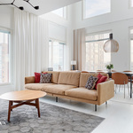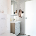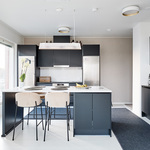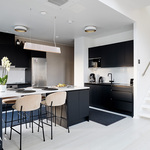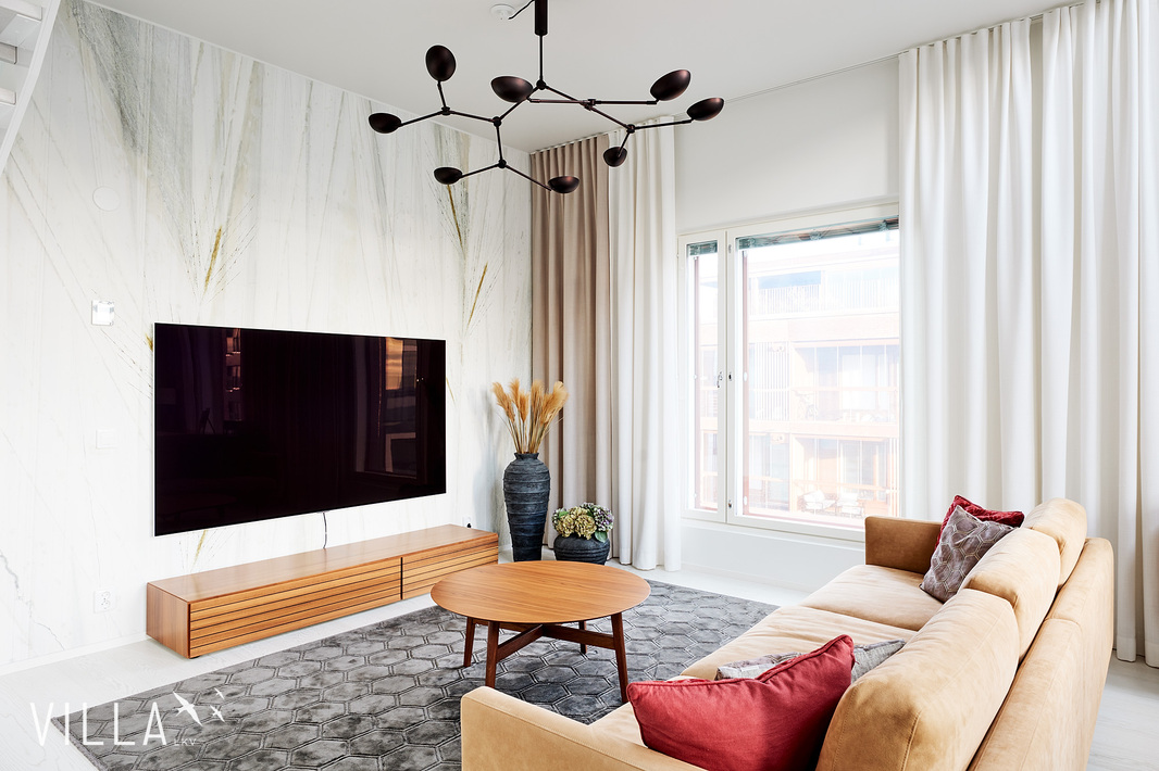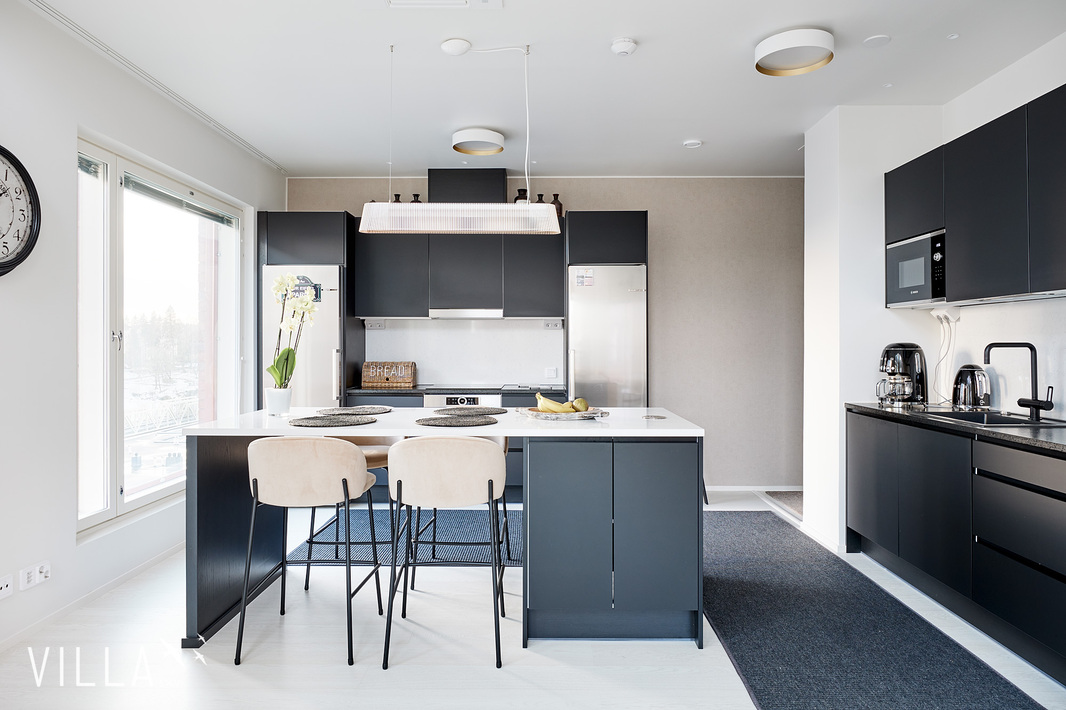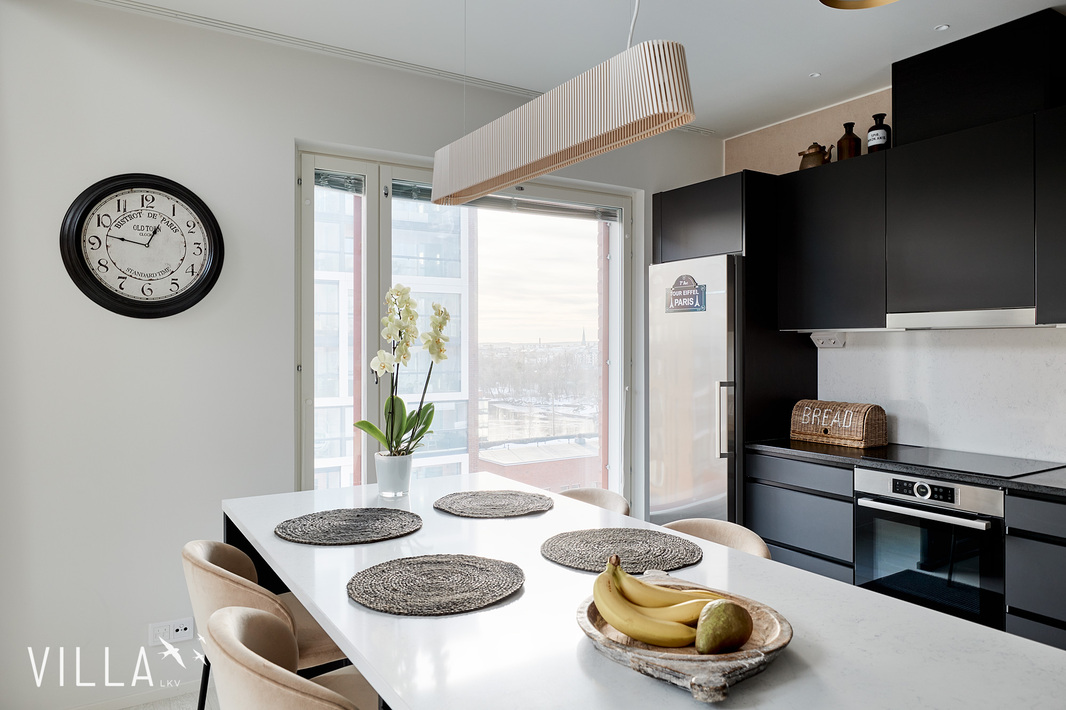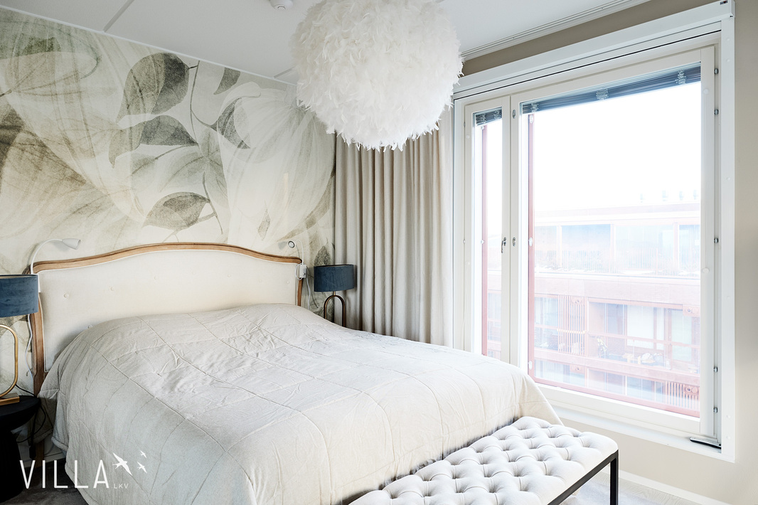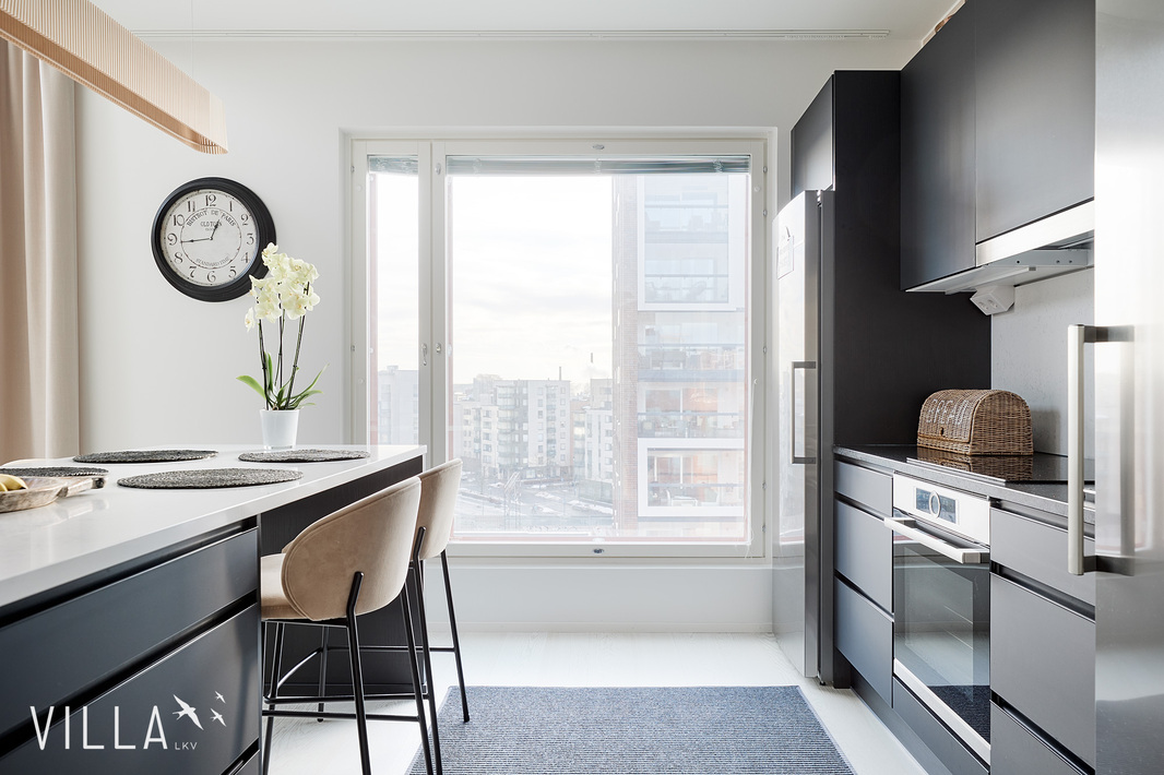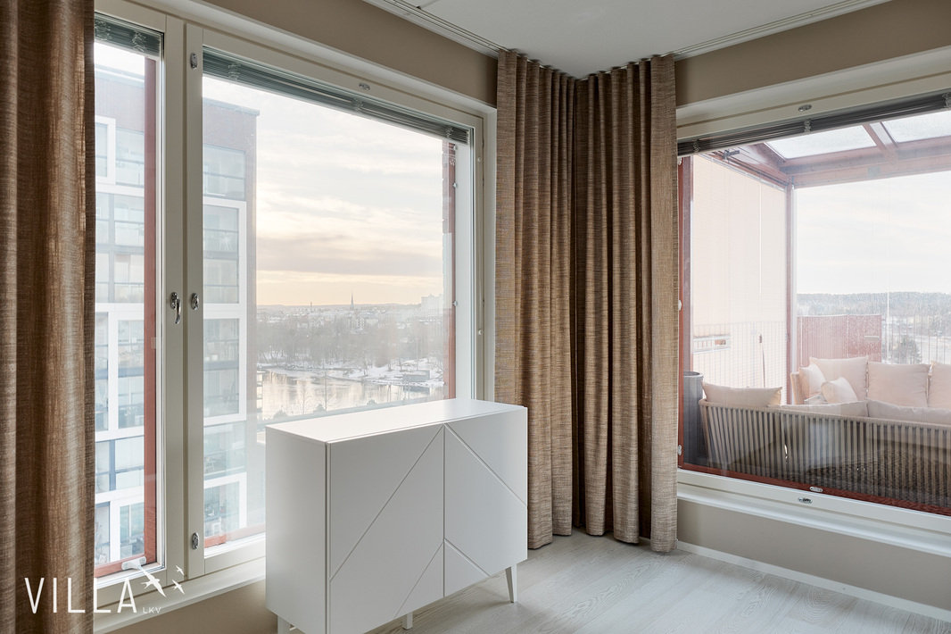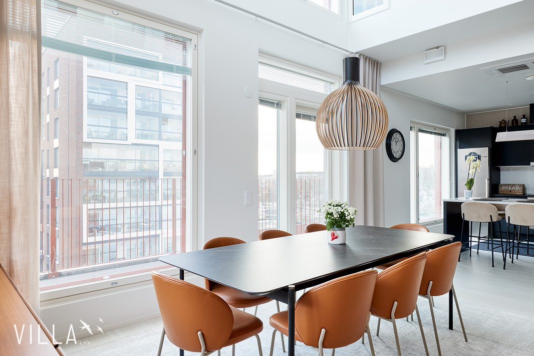Asunnon sisätiloissa laadukkuus näkyy jokaisessa yksityiskohdassa. Kaikki pintamateriaalit on valittu huolella ja jo rakennusvaiheessa tehdyt tasonparannustyöt viimeistelevät kokonaisuuden ajattoman tyylikkääksi. Olohuone hurmaa kahden kerroksen korkuisella huonetilallaan ja suurilla ikkunapinnoillaan, jotka tulvivat luonnonvaloa. Tila yhdistyy saumattomasti avokeittiöön muodostaen kodin viihtyisän sydämen. Aamukahvit nautitaan keittiön omalla parvekkeella auringonnousun äärellä.