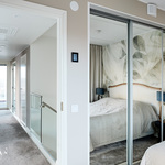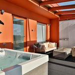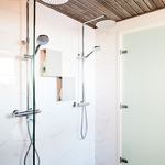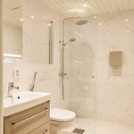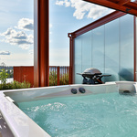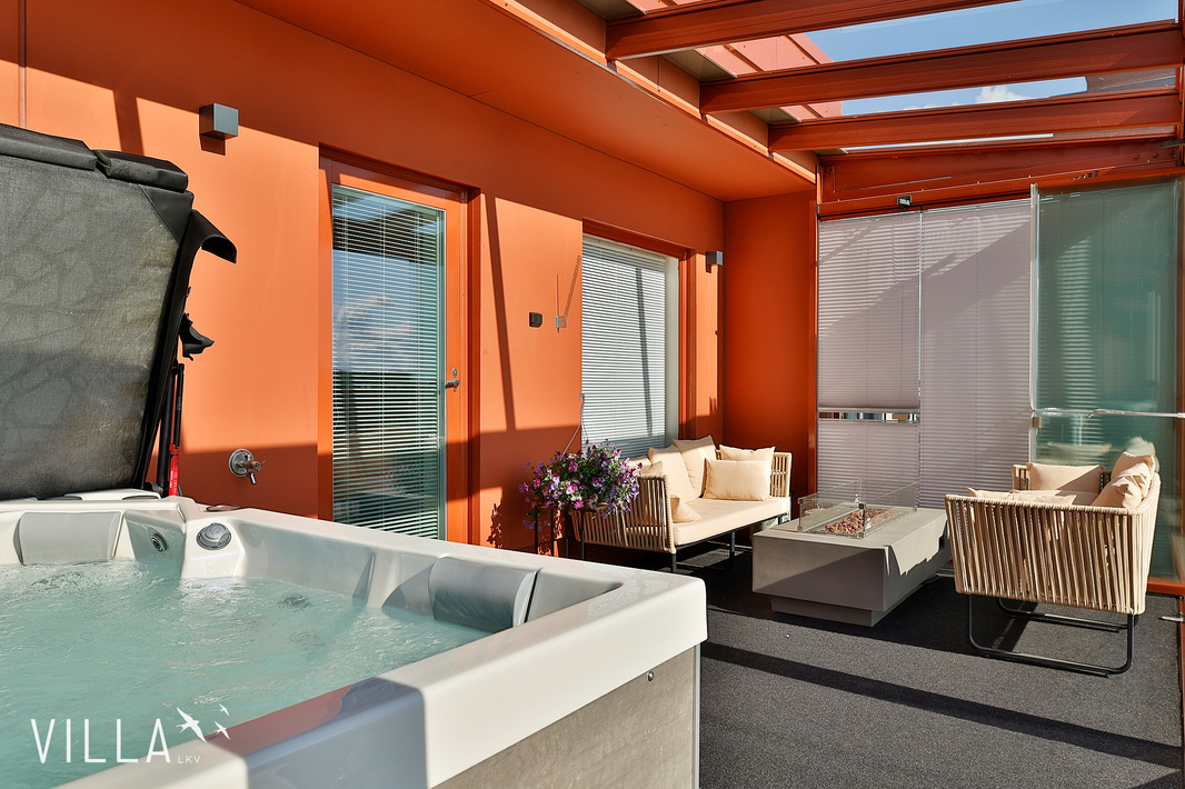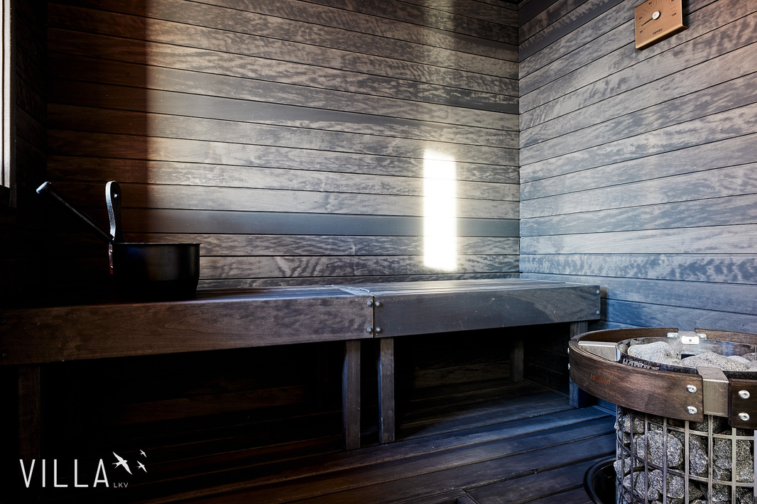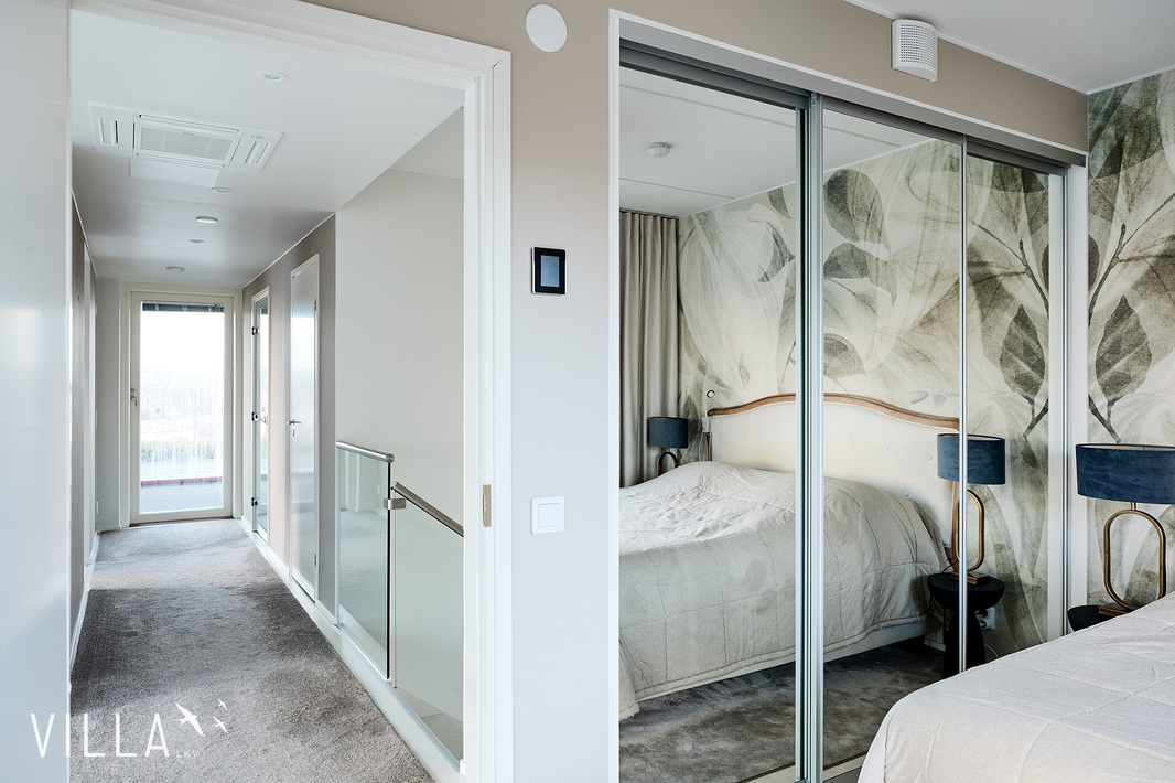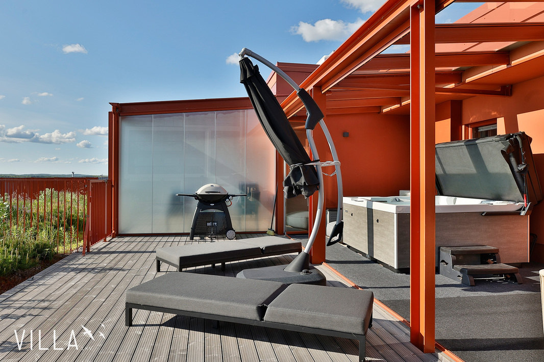Ylemmästä kerroksesta löytyvät makuuhuoneet, saunaosasto sekä tämän kodin ehdoton kruunu – suuri, osittain katettu ja lasitettu kattoterassi. Tämä yksityinen keidas tarjoaa ainutlaatuiset puitteet rentoutumiseen ja yhdessäoloon. Terassilla sijaitsee lämmitettävä poreallas, joka kutsuu nauttimaan arjesta ympäri vuoden. Aurinko siirtyy terassille jo päivällä ja laskee suoraan silmiesi edessä. Nämä näkymät länteen ovat vertaansa vailla.