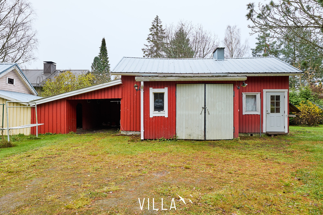 • Viileä piharakennus. Rakennuksessa on sähköt mutta ei lämmitystä. Piharakennus pitää sisällään autotallin, varaston ja autotallin.
