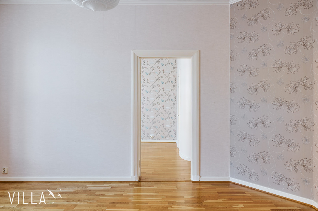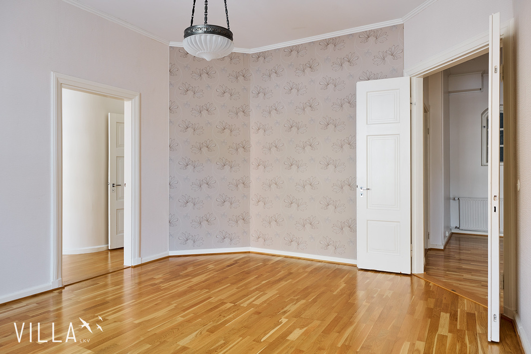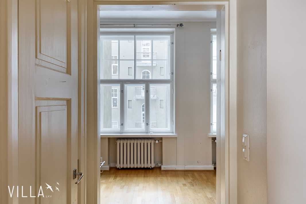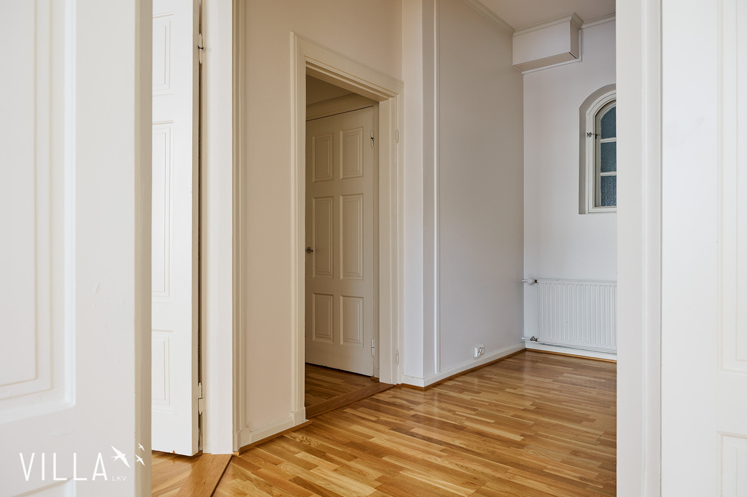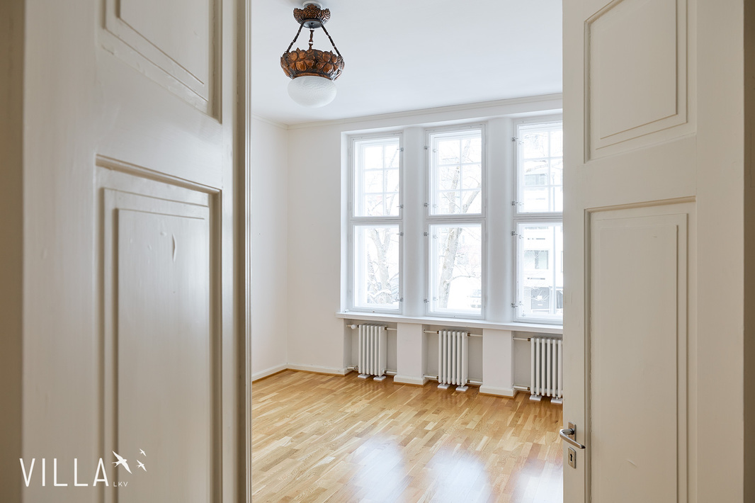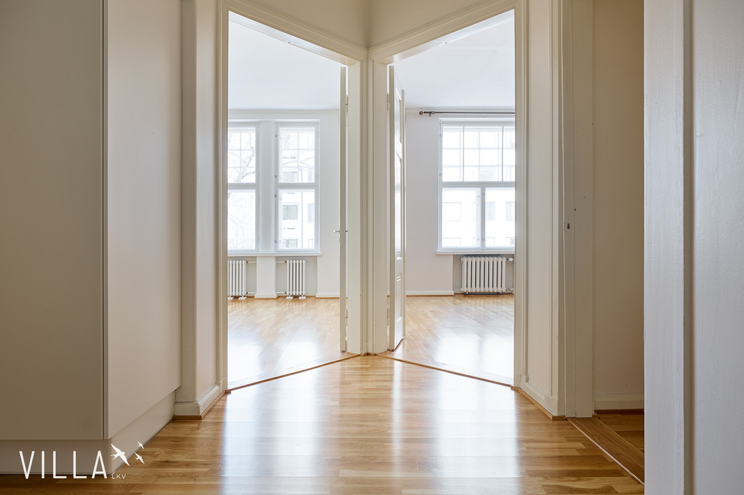 Tässä asunnossa jugend-ajan parhaat ominaispiirteet pääsevät oikeuksiinsa. Oleskelutilat ovat poikkeuksellisen avarat ja mittasuhteiltaan vaikuttavat. Hulppea huonekorkeus luo tilaan ilmavuutta ja arvokkuutta, jota uudemmassa rakentamisessa harvoin kohtaa. Syvät ikkunalaudat ja kauniit ikkunaruutujaot kehystävät luonnonvalon pehmeästi sisään ja muistuttavat aikakaudesta, jolloin arkkitehtuuri oli myös käsityötä.