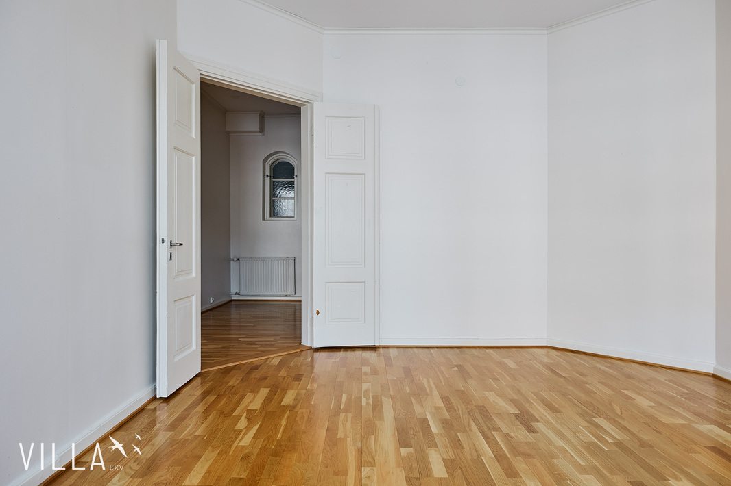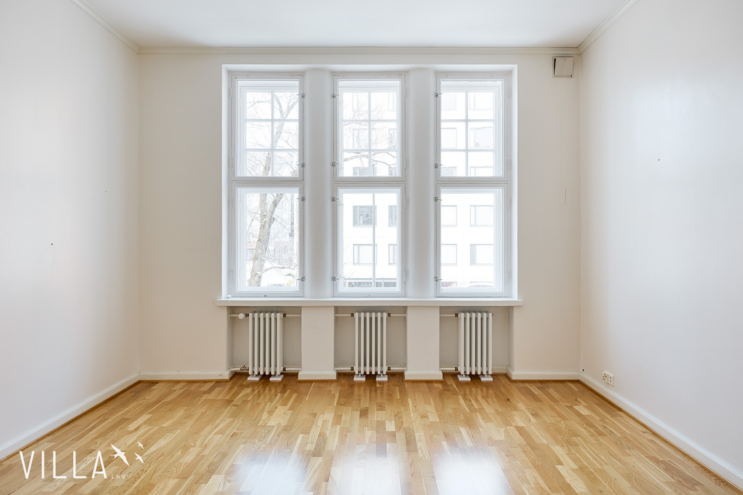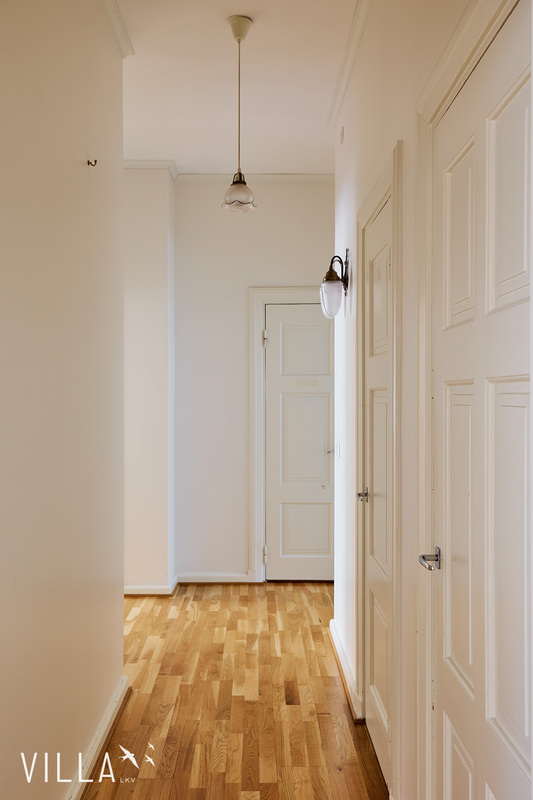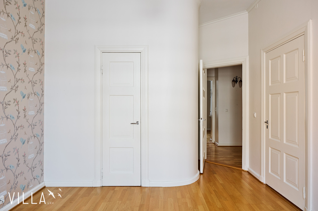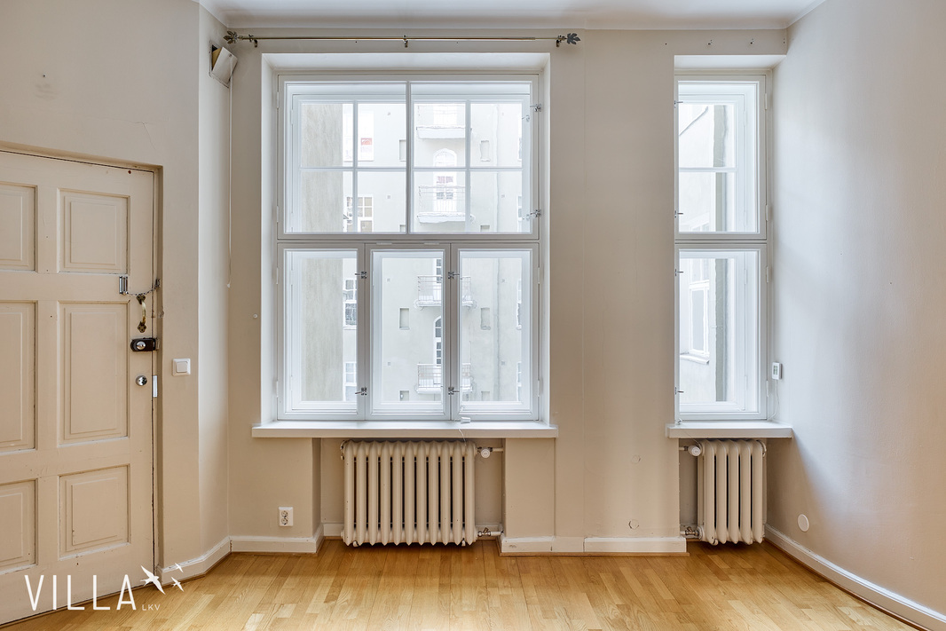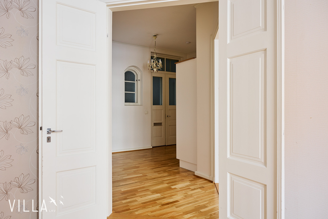 Tässä asunnossa jugend-ajan parhaat ominaispiirteet pääsevät oikeuksiinsa. Oleskelutilat ovat poikkeuksellisen avarat ja mittasuhteiltaan vaikuttavat. Hulppea huonekorkeus luo tilaan ilmavuutta ja arvokkuutta, jota uudemmassa rakentamisessa harvoin kohtaa. Syvät ikkunalaudat ja kauniit ikkunaruutujaot kehystävät luonnonvalon pehmeästi sisään ja muistuttavat aikakaudesta, jolloin arkkitehtuuri oli myös käsityötä.