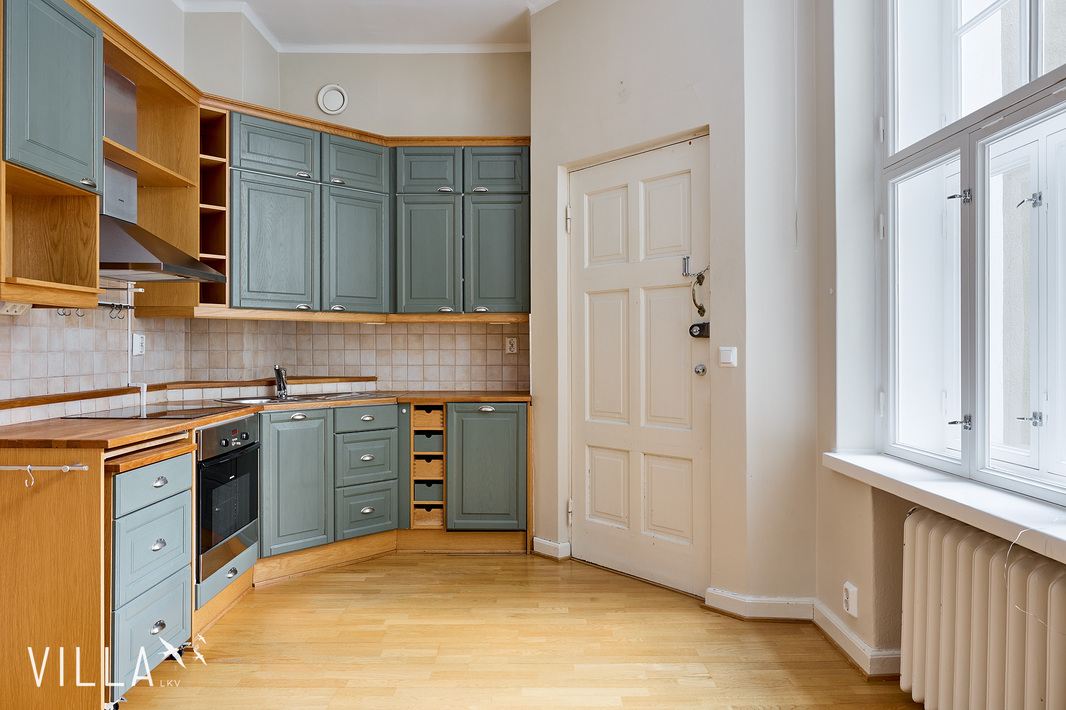 | Keittiön varustelu | Keittiöstä on kulku sisäpihan rappukäytävään alkuperäisen ns. piianoven kautta. |