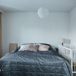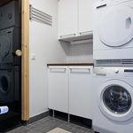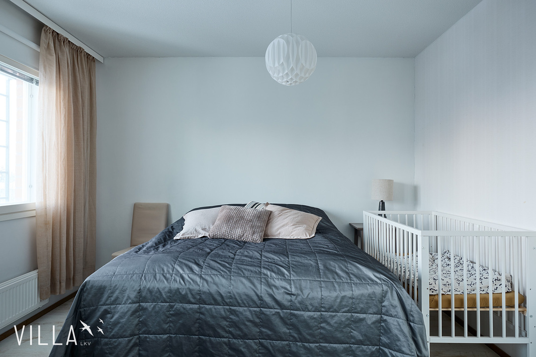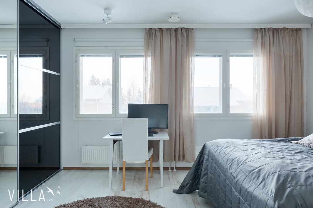 Makuuhuoneet ovat tilavia ja sijoittuvat yläkertaan. Samassa kerroksessa sijaitsee myös kodinhoitohuone, joka toimii luontevasti pukuhuoneena pesutilojen ja saunan yhteydessä. Ratkaisu on selkeä ja käytännöllinen.