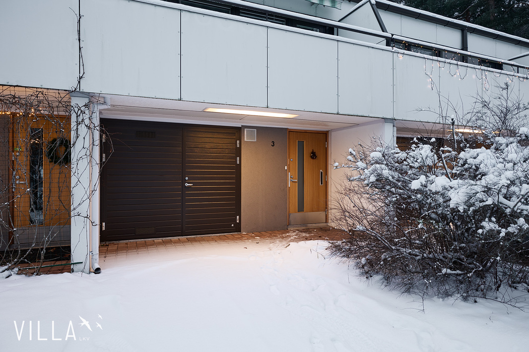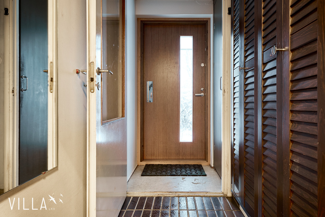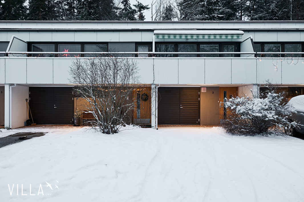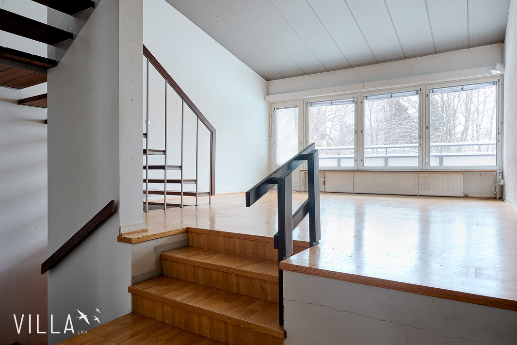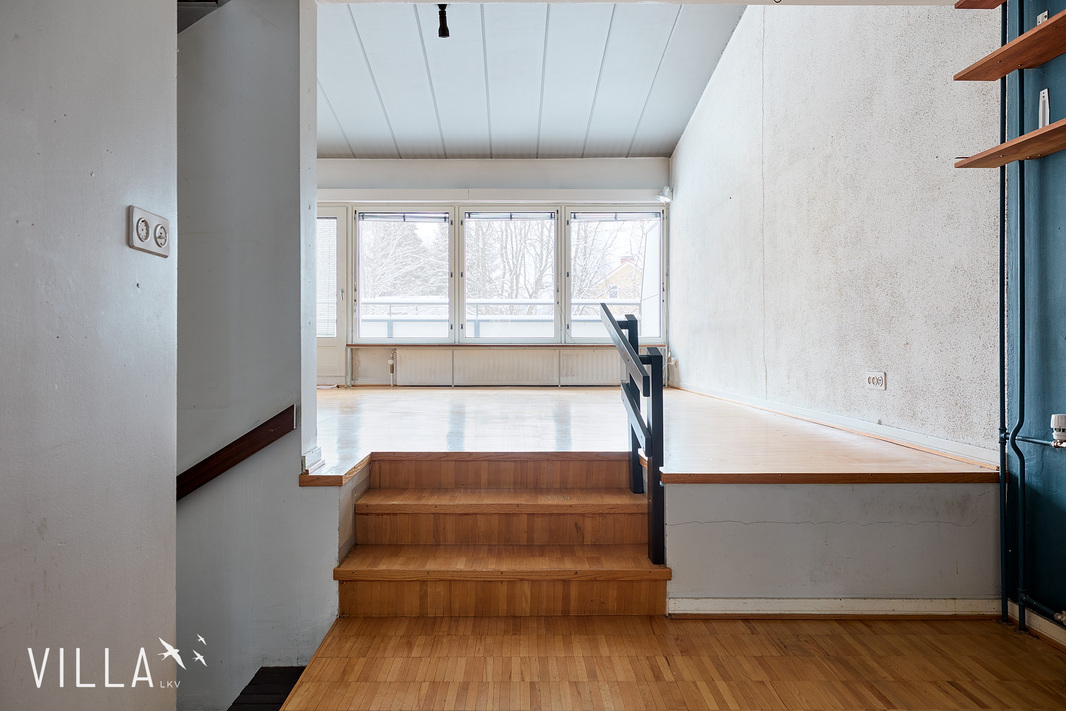 Tämä 1960-luvun rivitaloasunto tarjoaa asuintilat kolmessa kerroksessa ja osittain eri tasoissa. Muutamat portaat rytmittävät tiloja ja tuovat kokonaisuuteen persoonallisuutta sekä aikakaudelle ominaista arkkitehtonista ilmettä.