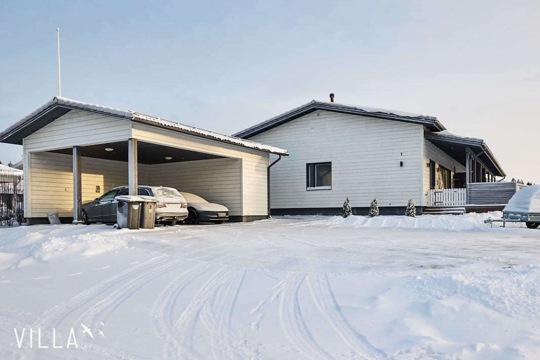 Reilunkokoinen, suojaisa terassi ja helppohoitoinen piha tarjoavat mukavaa lisätilaa oleskeluun. Asfaltoidulta etupihalta löytyvät autokatospaikka, pihapaikka sekä varasto. Talo sijaitsee hieman tien tasoa korkeammalla, minkä ansiosta pihasta ja oleskelutilojen ikkunoista avautuu rauhallinen, puistomainen näkymä.