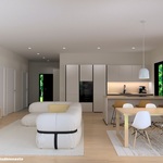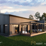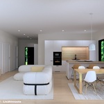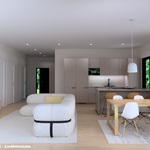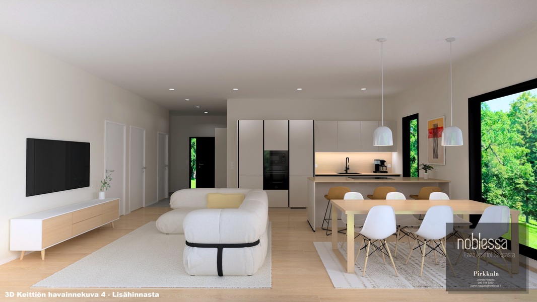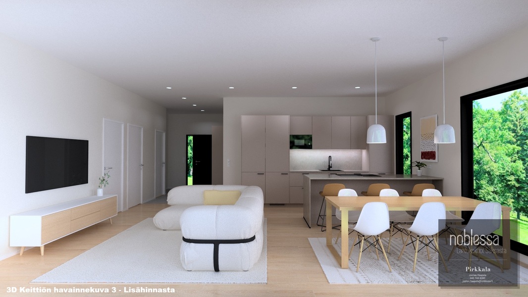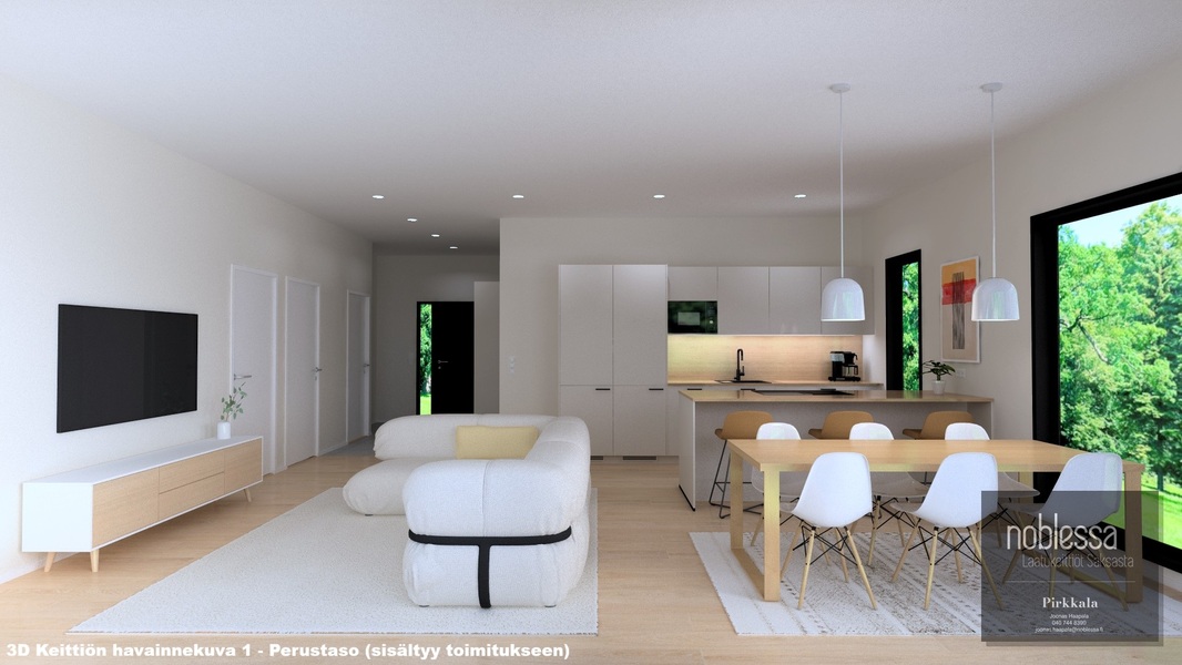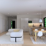 Oleskelutilat avautuvat luontevasti toisiinsa, ja suuret ikkunapinnat tuovat sisälle runsaasti luonnonvaloa. Keittiö ja olohuone muodostavat yhtenäisen, ajattoman kokonaisuuden, joka palvelee arkea ja yhdessäoloa vaivattomasti. Näyttävä lasiliukuovi avaa kulun terassille ja jatkaa oleskelutiloja luontevasti ulos. Materiaalivalinnat ovat kestävät ja hillityn tyylikkäät. Kokonaisuus on rauhallinen, helposti sisustettava ja ajaton.