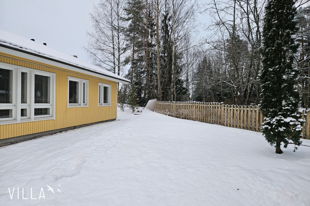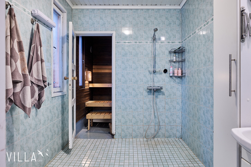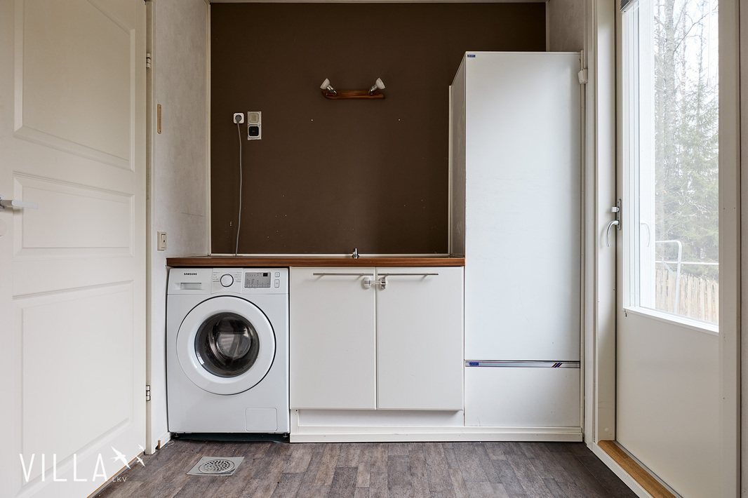 Tilavasta kodinhoitohuoneesta on käynti ulos ja se palvelee hyvin sekä arjen pyykkihuoltoa että pesuhuoneen ja saunan pukuhuoneena. Saunan löylyistä nautitaan puukiukaan lämmössä. Talon pintoja ja tekniikkaa on uusittu vuosien varrella – muun muassa peltikatto on vaihdettu, ulkoverhous maalattu ja ilmanvaihtojärjestelmä päivitetty lämmöntalteenotolla varustettuun malliin.