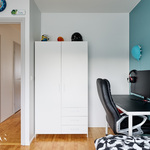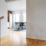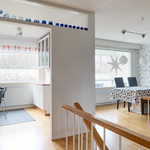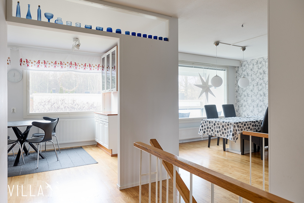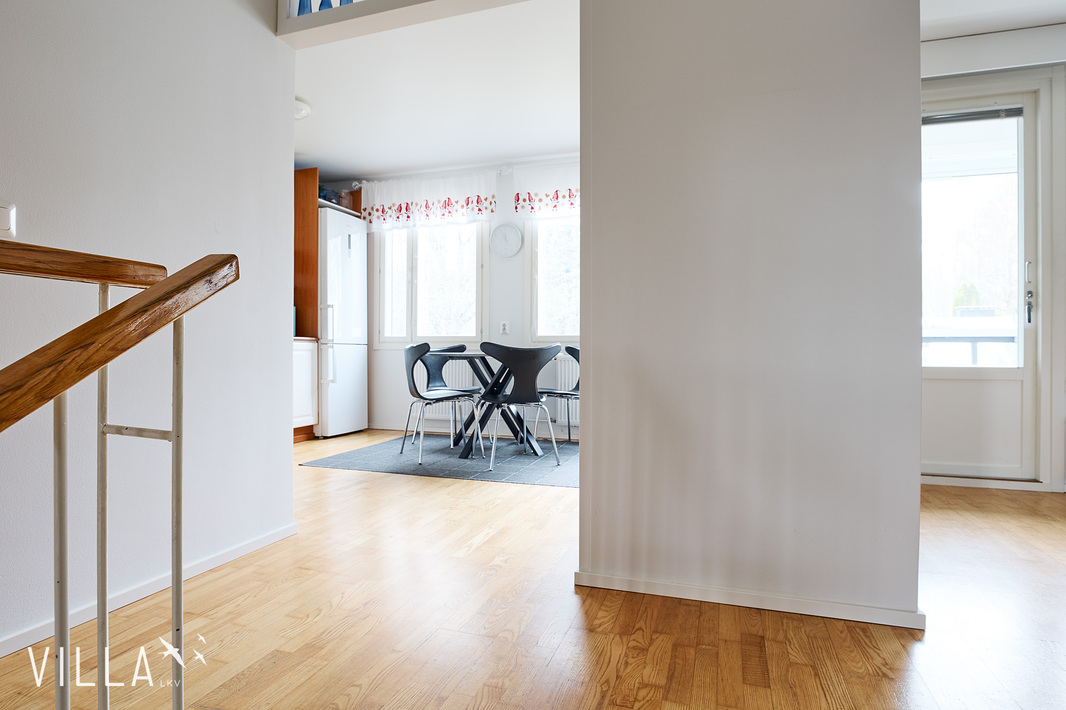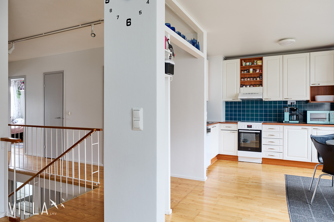 Tämä kahteen kerrokseen jakautuva huoneisto tarjoaa toimivan ja selkeän pohjaratkaisun, joka palvelee erinomaisesti niin arkea kuin vapaa-aikaa. Tilaa on runsaasti myös isomman perheen tarpeisiin, ja kokonaisuus on suunniteltu asumismukavuus edellä.