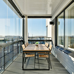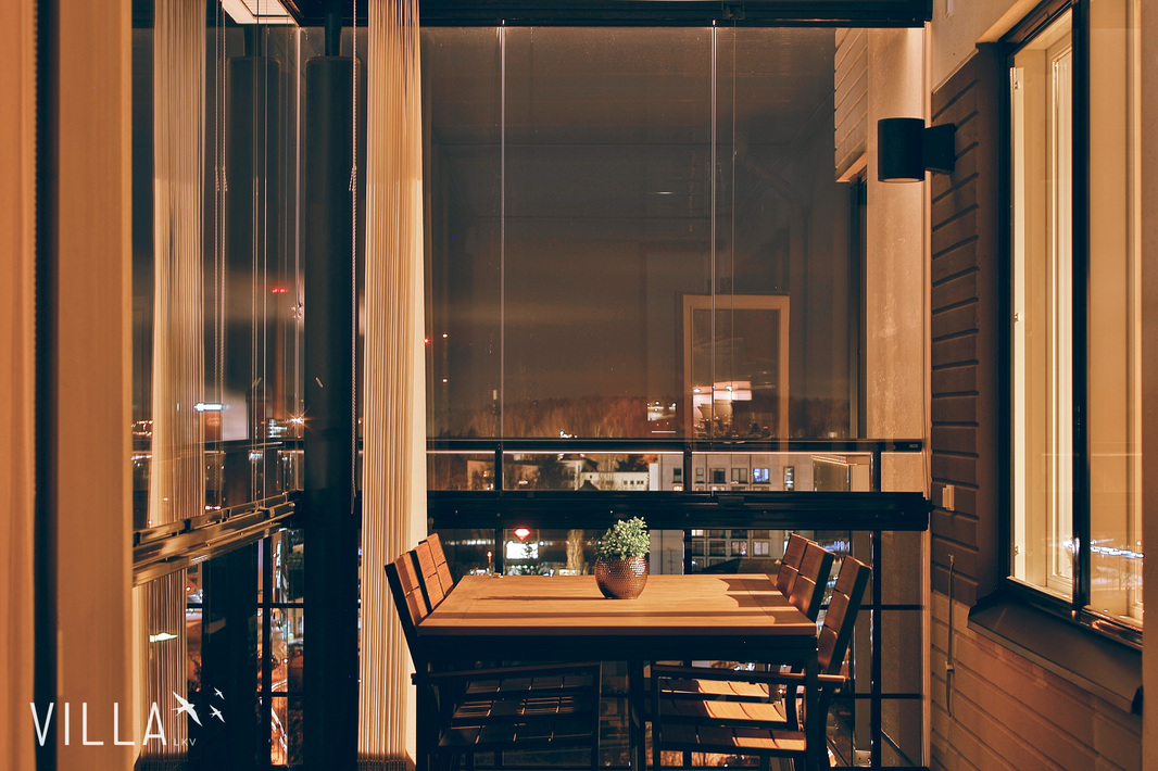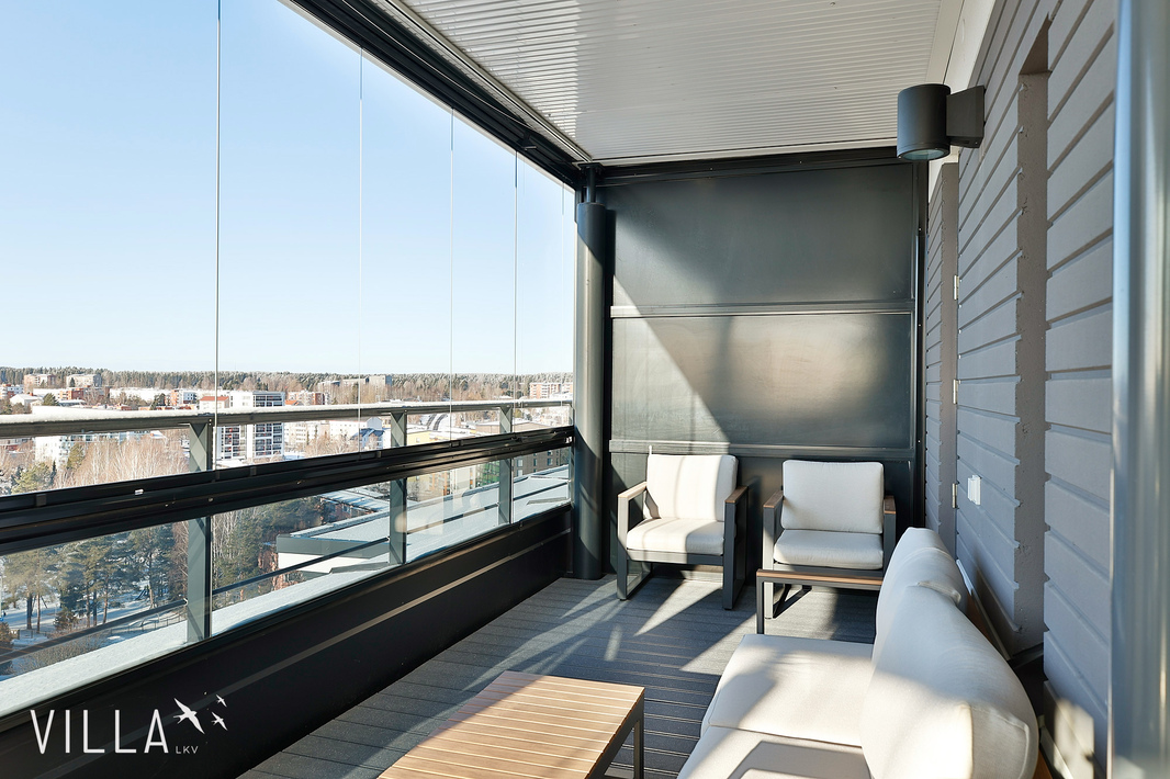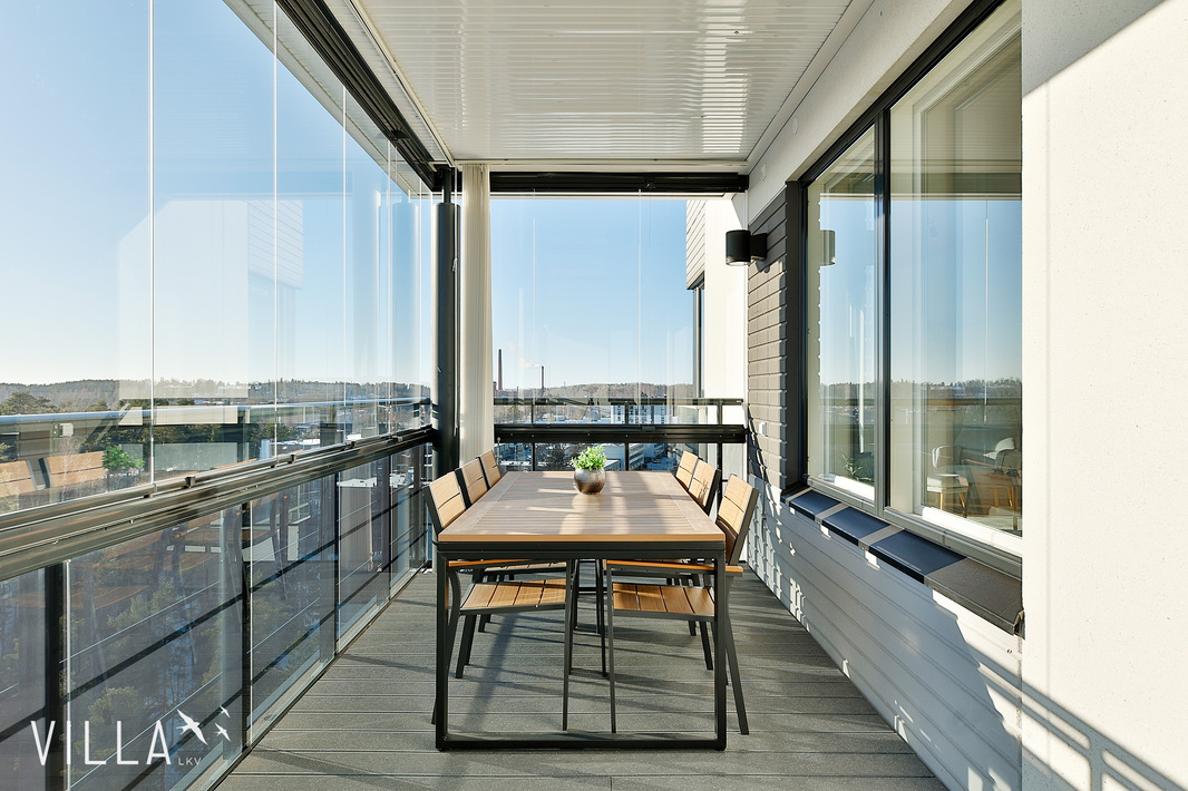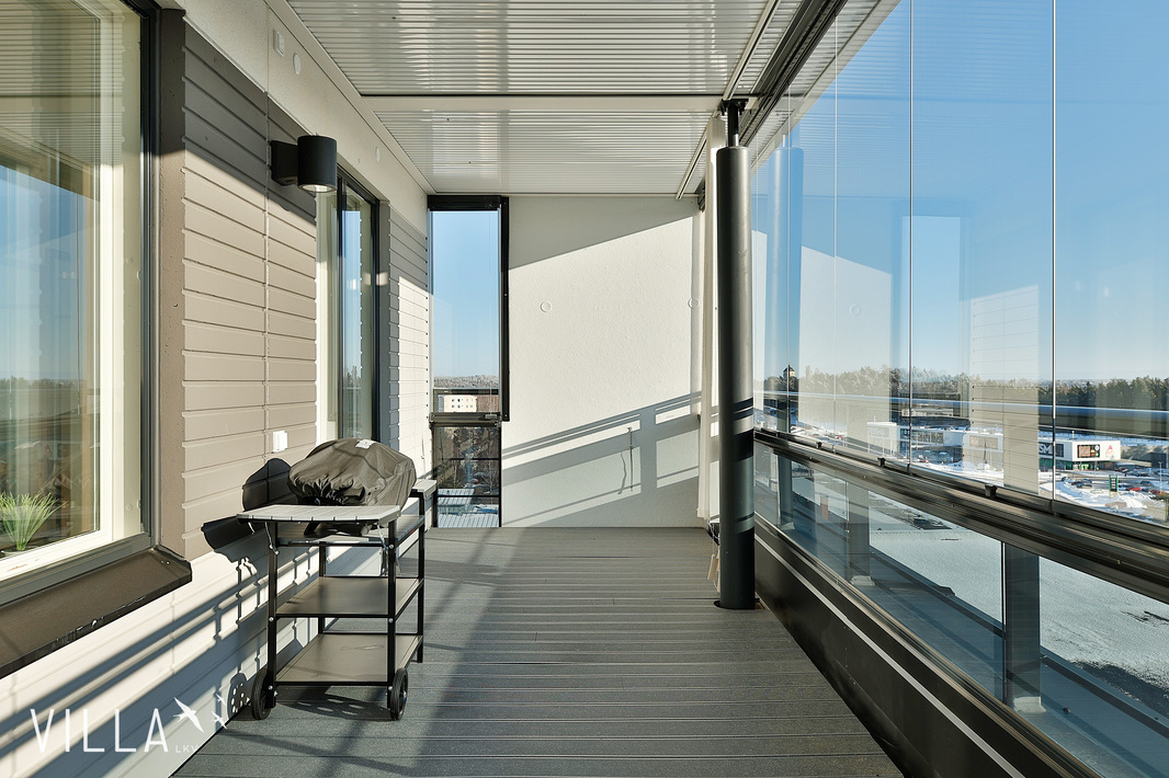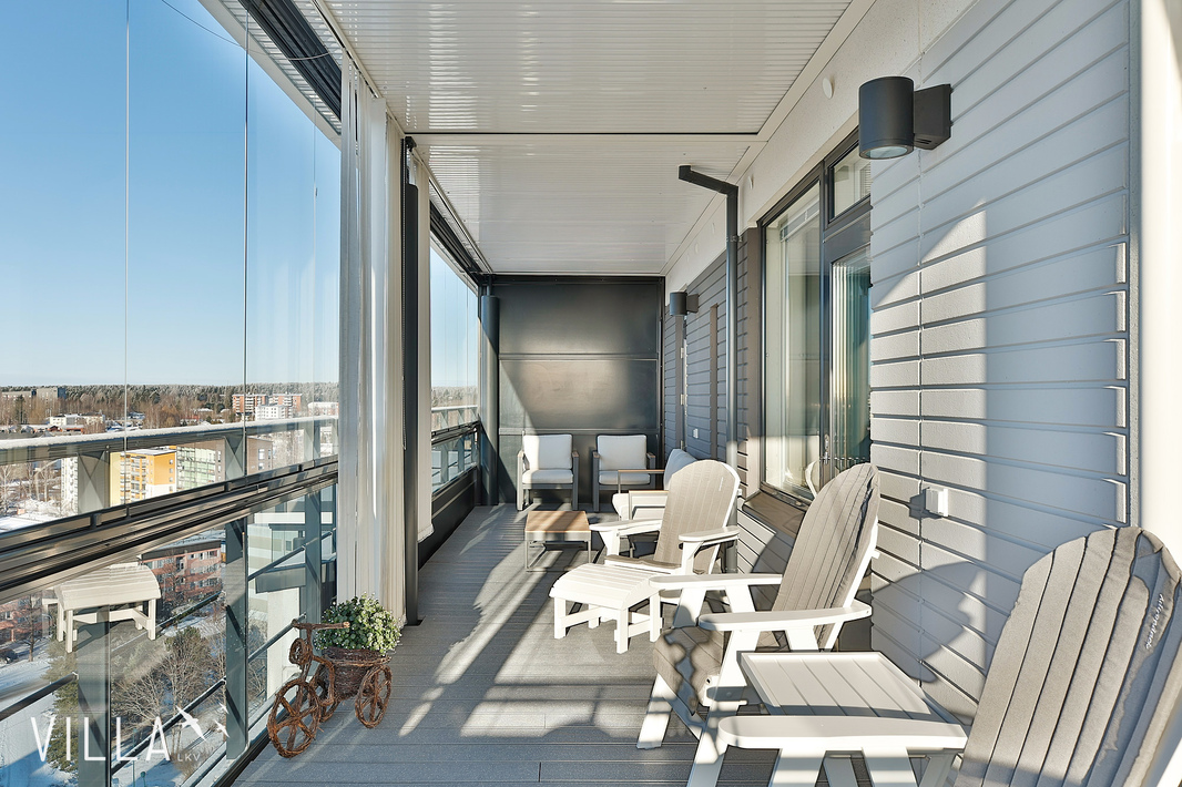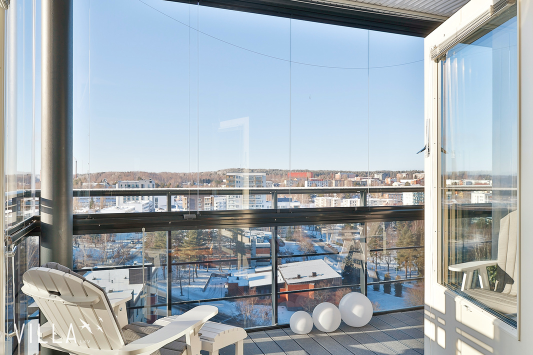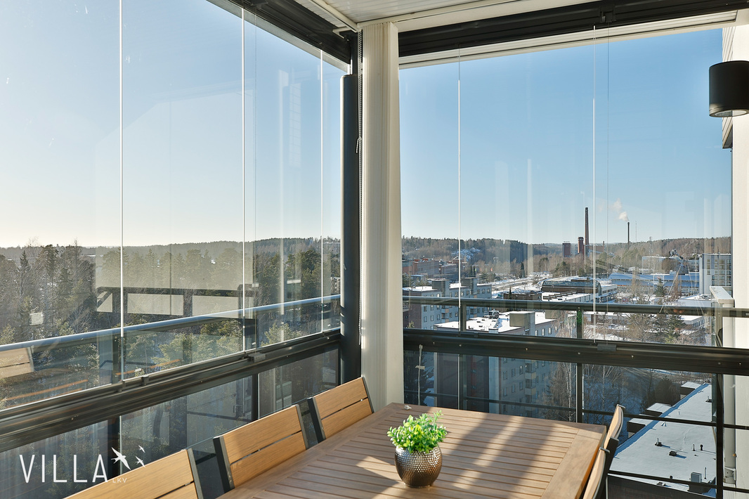 Kodin kaksi hulppean kokoista, lasitettua kattoterassia avautuvat eri ilmansuuntiin. Länteen suuntautuvalta terassilta voi seurata ilta-aurinkoa ja auringonlaskuja. Etelän puoleinen terassi avaa näkymät yli harjualueiden, kirkkaalla säällä aina Tampereen Pispalanharjulle saakka. Näkymät ja avoin horisontti luovat asumiseen poikkeuksellista tilan tuntua.