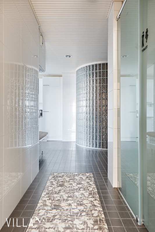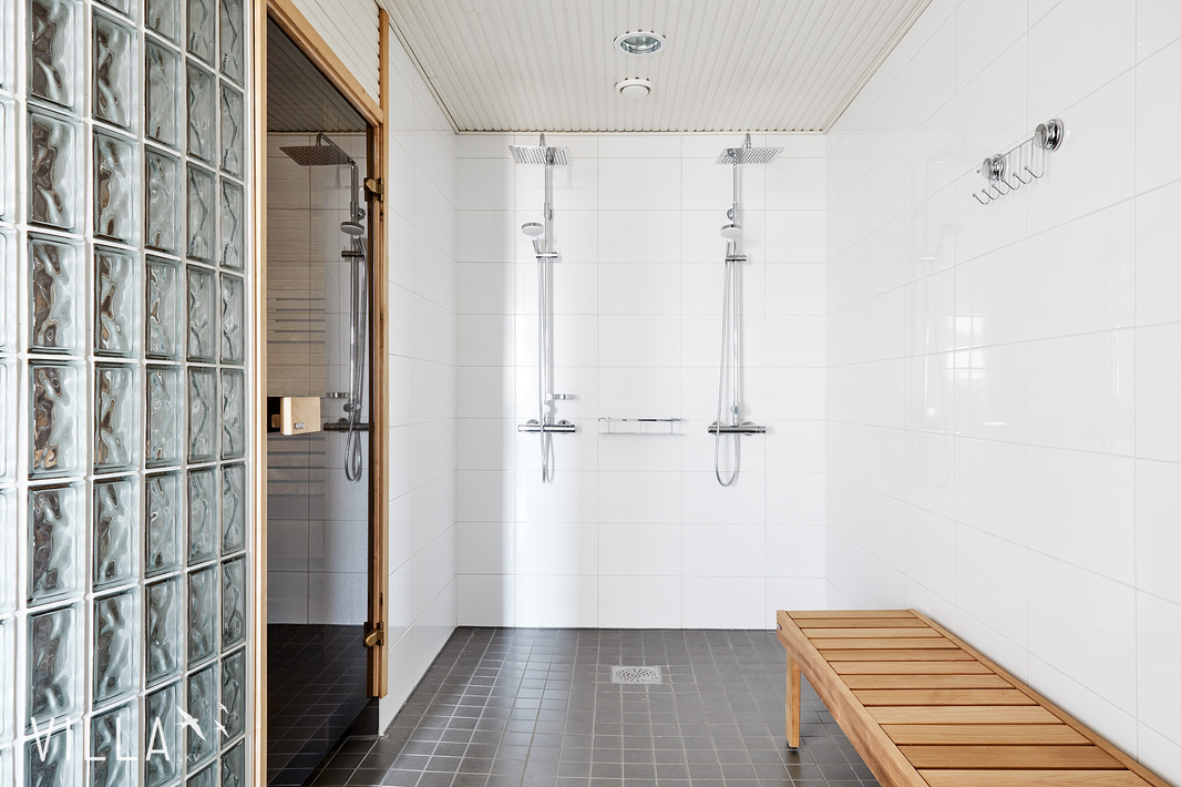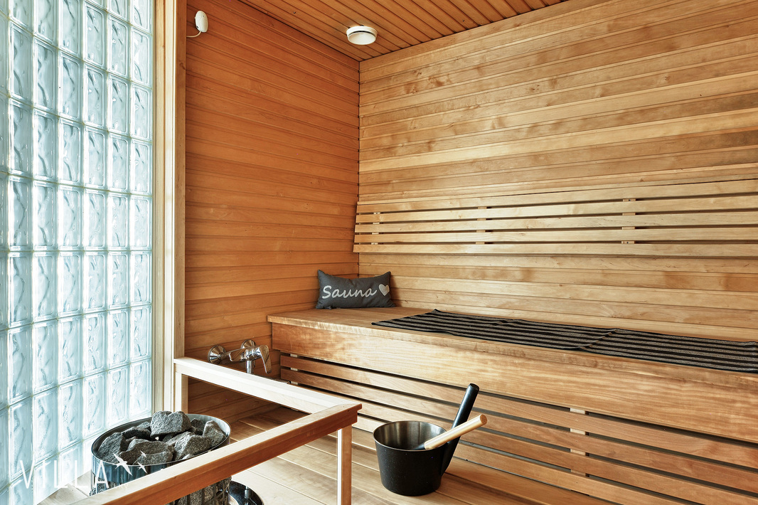 Oleskelutilat muodostavat näyttävän ja toimivan kokonaisuuden. Olohuoneen tunnelmaa täydentää tyylikäs takka ja hyvin varusteltu keittiö yhdistyy luontevasti ruokailutilaan ja oleskelutilaan. Avara kokonaisuus tarjoaa erinomaiset puitteet niin asumiseen kuin yhdessäoloon. Tilava saunaosasto viimeistelee kokonaisuuden ja sieltä on suora kulku terassille vilvoittelemaan.