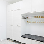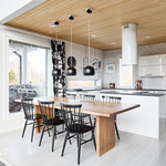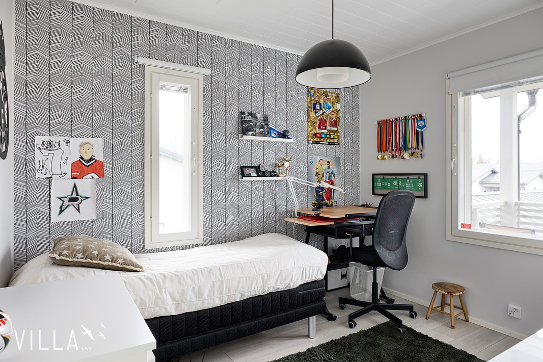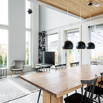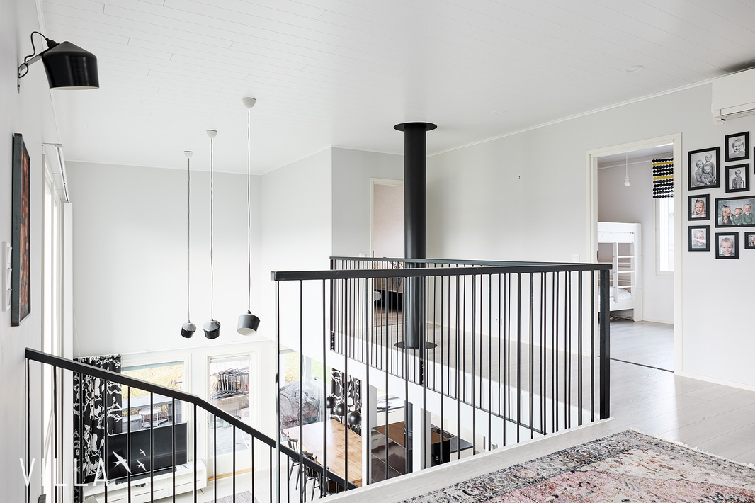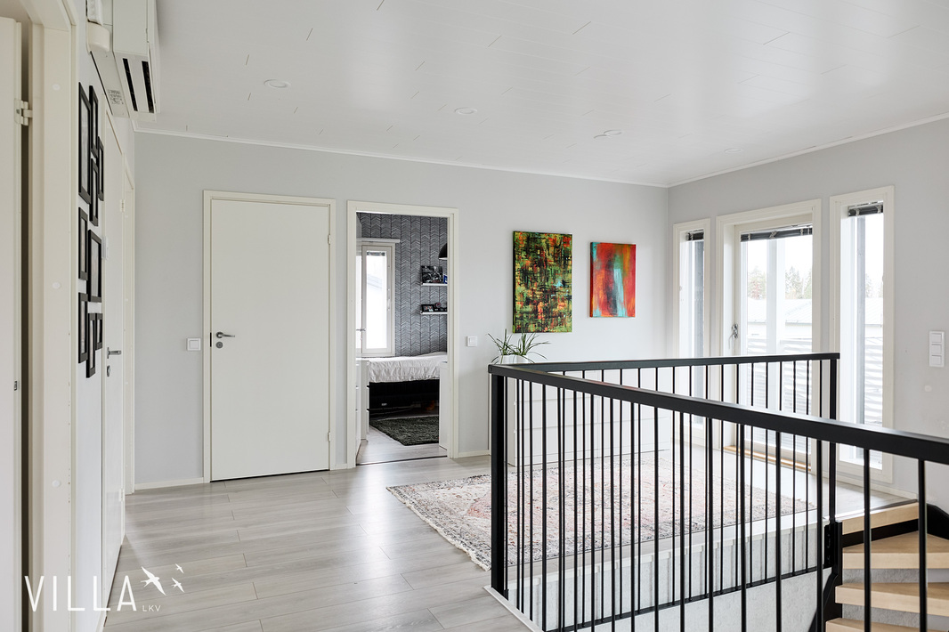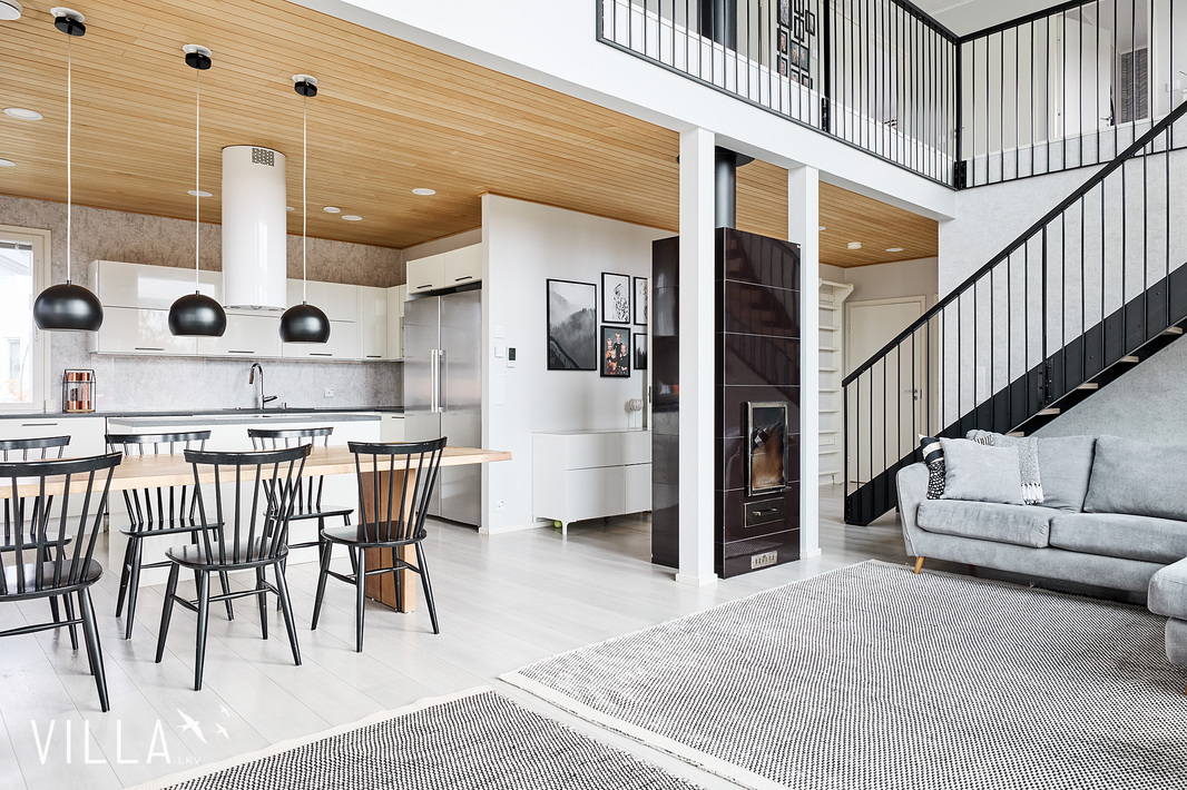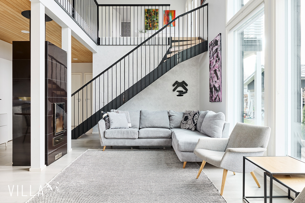 Tässä kodissa on peräti viisi makuuhuonetta, harvinainen löytö, joka tarjoaa reilusti tilaa niin isommalle perheelle kuin etätyötä tekeville. Asumismukavuuden takaa ennen kaikkea loistava, kahteen tasoon jakautuva pohjaratkaisu sekä laadukkaat materiaalivalinnat. Onnistuneen arkkitehtuurin ansiosta oleskelutiloja korostaa hulppea huonekorkeus ja suuret, lähes koko seinustan kattavat ikkunat.