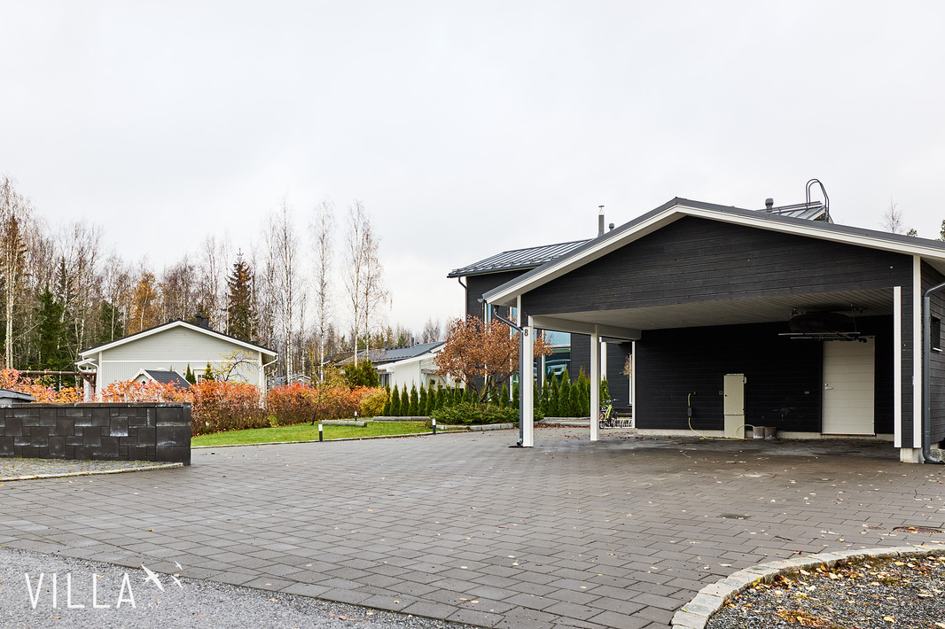 Pihapiiri on viimeistelty ja näin ollen kivetys, istutukset ja vehreä nurmialue muodostavat huolitellun kokonaisuuden. Suojaisa piha ja reilunkokoinen, osittain katettu terassi tarjoavat ihanteelliset puitteet oleskeluun ja kesäisiin hetkiin. Lisäksi pihasta löytyy erillinen talousrakennus, jossa on kaksi lämmintä varastoa sekä kahden auton katos.